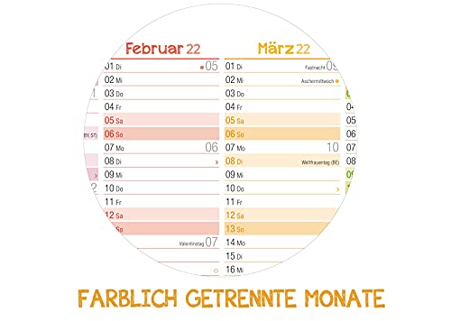 De jaarplanner is een handige, dubbelzijdig bedrukte kalender in A4-formaat (30 x 22 cm). De voorzijde omvat het eerste halve jaar 2022 (januari – juni) en een praktisch vakantieoverzicht voor alle Duitse deelstaten. Op de achterkant gaat het met het tweede halve jaar 2022 verder (juli – december). Bovendien is er al eens een overzicht van het jaar 2023. Er is gezorgd voor voldoende ruimte voor het schrijven van verjaardagen, afspraken, vakantieplannen en andere gebeurtenissen. En: dankzij het hoogwaardige papier kan de kalender met alle denkbare schrijfgerei worden beschreven van potlood tot balpen. Kortom: de jaarplanner biedt een volledig eenvoudige en gestructureerde planning van het dagelijks leven.