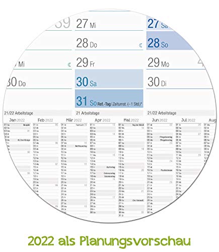 Alles inbegrepen: ruimte voor notities + jaarlijkse preview voor 2022! Formaat van de grote jaarplanner: 89 cm x 63 cm (groter dan DIN A1), wordt opgerold en in stevige kartonnen verpakking geleverd