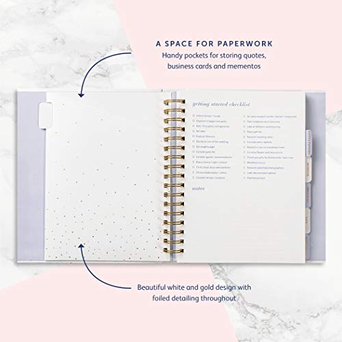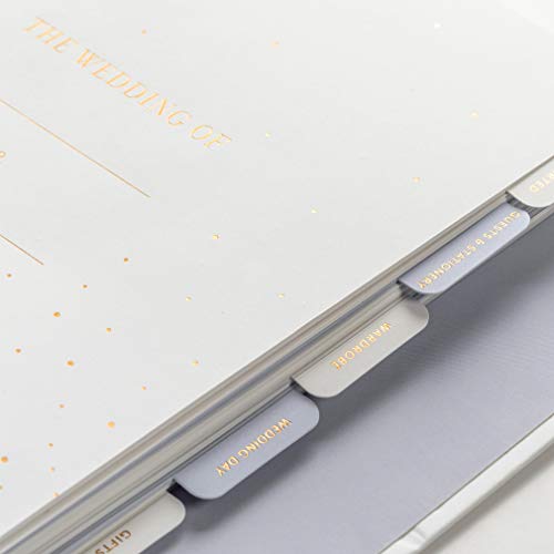 Inclusief 6 secties met tabbladen: Aan de slag, gasten & briefpapier, kledingkast, trouwdag, geschenken, contacten en notities voor het plannen van elk detail plus ruimte voor notities en drie opbergvakken.