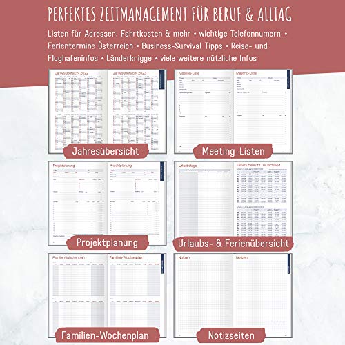 Doordacht & overzichtelijk: agenda met halve uur-takt, wekelijkse topprojecten en to-do’s, projectplanner, vergaderlijsten, inspirerende spreuken, adreslijsten, landen, praktisch reiskostenoverzicht en meer.