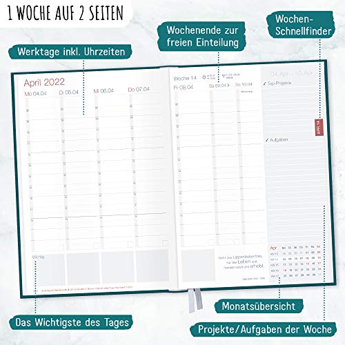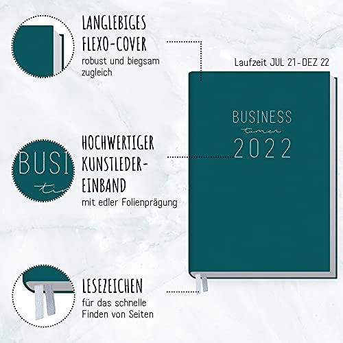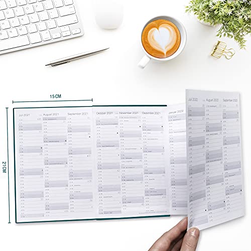 Zakelijke planner 2021/2022 A5 – kalender voor 18 maanden met 1 week op 2 pagina’s, leeslinten, maandoverzicht voor elke maand en een groot jaaroverzicht om open te klappen. De looptijd is van juli 2021 tot december 2022.