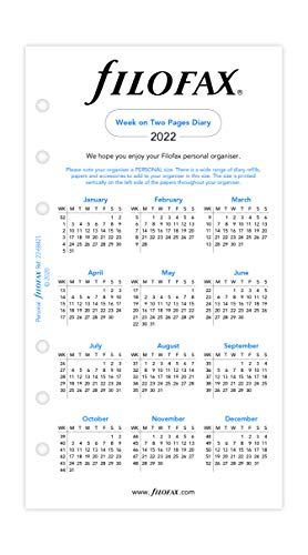 Dit Filofax Personal 2022 dagboek is een week op twee pagina’s formaat in het Engels, met de week te bekijken vanaf een maandag. januari tot december 2022. Papierformaat 95mm x 171mm, geboord met zes ronde gaten.