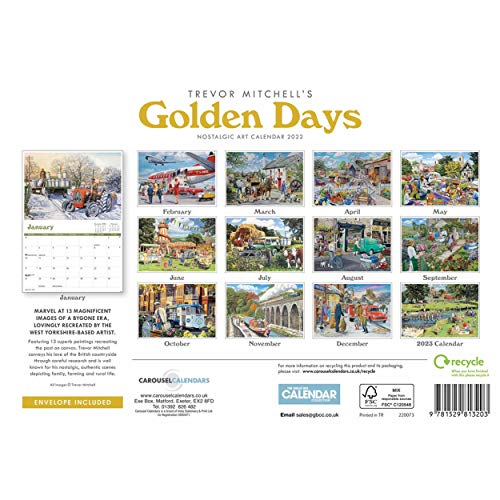 Marvel at magnificent images of a bygone era, lovingly recreated by the West Yorkshire based artist, Trevor Mitchell. Each month of the Golden Days A4 calendar for 2022 illustrates his love of the British countryside, in his nostalgic scenes depicting family and rural life. Includes postal envelope.