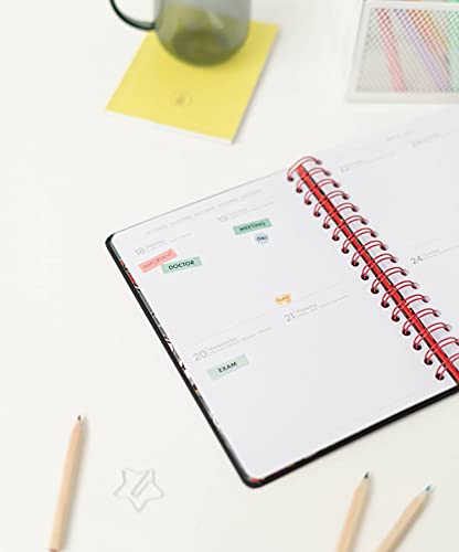 Schoolagenda met weekoverzicht, A5, 12 maanden, augustus 2021 tot juli 2022. De week georganiseerd in één oogopslag. Zo kun je altijd vooruitkijken wat naar je komt. Het heeft een hardcover-cover, jaaroverzicht 2021 en 2022, 4 lesroosters van maandag tot zondag en maandoverzicht met ruimte voor notities voor elke maand.