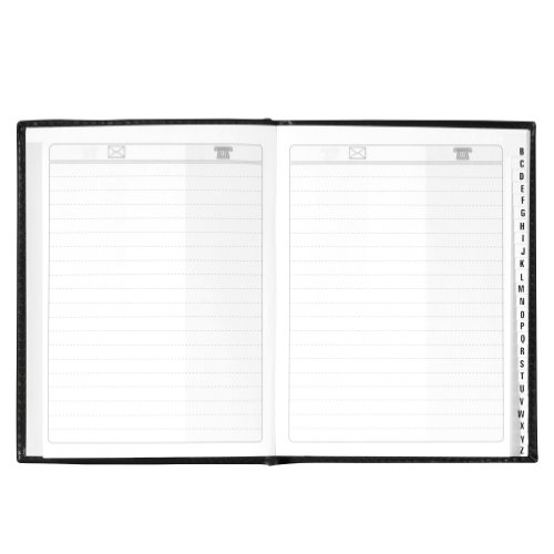 Adresboek 10,5 x 13,5 cm. Uitvoering papier: 70 g/m², houtvrij, draadbinding. Toepassing voor etiket: handbelettering PU kunstleren omslag, diverse kleuren: zwart, donkerblauw, m. 26-delig. Tabbladen A-Z. Aantal vellen: 60.