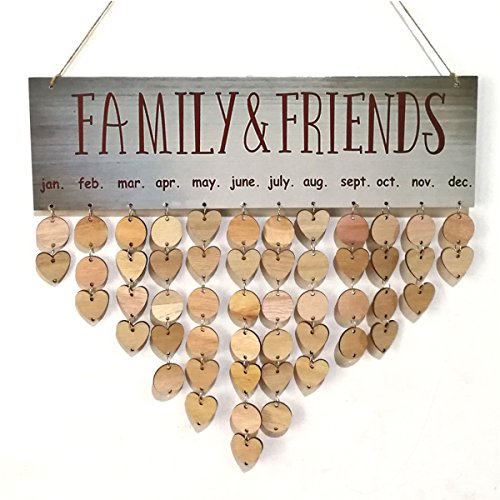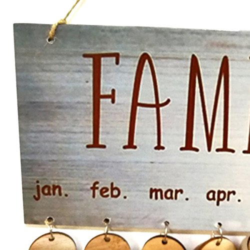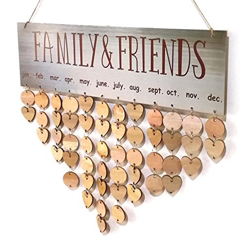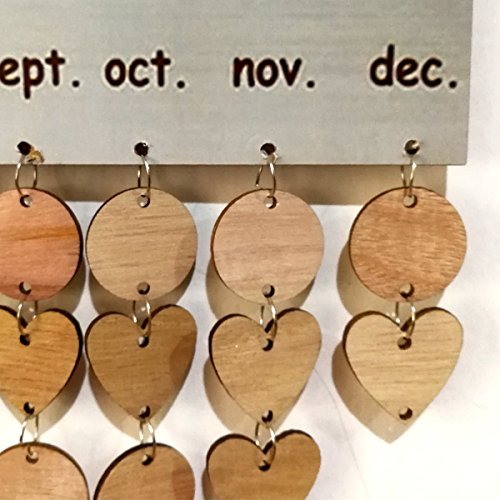 Deze houten kalander wordt geleverd met 1 plaquette, 25 ronde schijven, 25 hartschijven en 50 ijzeren lussen. Alles wat je hoeft te doen, is op de houten schijf de naam en de datum te schrijven en vervolgens hang het onder de betreffende maand van de kalender. Geweldige herinnering voor de verjaardag van vrienden, Moederdag, Vaderdag, enz.