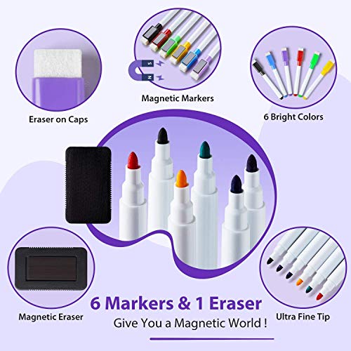 6 niet-giftige markers & een wisser: niets houdt meer georganiseerd dan kleurcodering, daarom hebben we 6 magnetische whiteboard pennen in verschillende felle kleuren opgenomen. Gebruik het kleursysteem van oranje, groen, roze, zwart, blauw en paars om verschillende taken of activiteiten te labelen. Een magnetische drooggum ook inbegrepen.